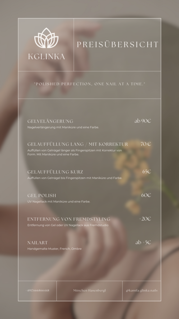 Schöne Nägel verdienen keine komplizierten Preise – bei uns sind die Preise transparent und fair gestaltet, damit du dich rundum wohlfühlen kannst. Lehne dich entspannt zurück und genieße deinen Moment bei uns, während wir dafür sorgen, dass deine Nägel im besten Licht strahlen.